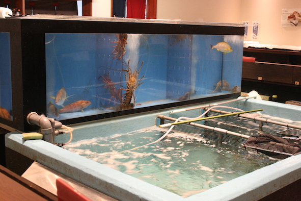 おひとり様向けの大きな生け簀を囲むカウンターは人気のお席です。注文を受けた鯵を取りにくる様子を間近で見ることができます。